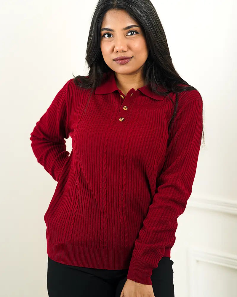Red Cable Knit Polo Sweater